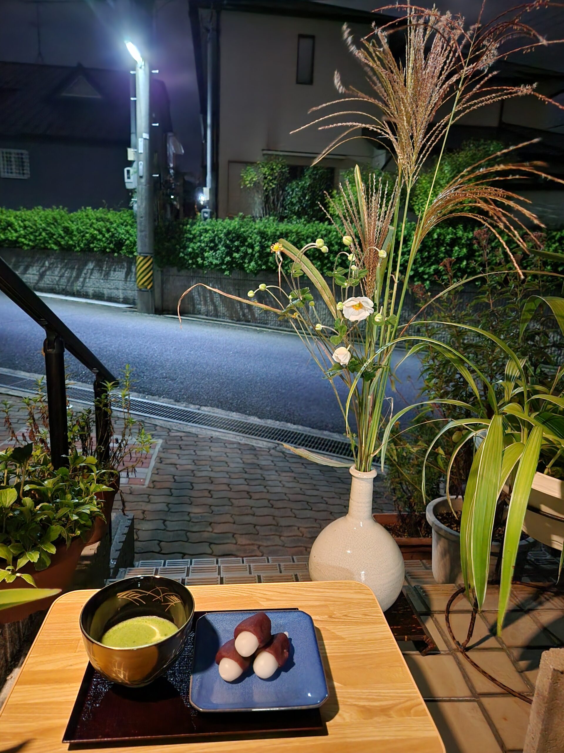 今夜は仲秋の名月ですね。 お月様は一瞬顔を覗かせてくれました。 お花は、秋明菊、ススキ。月見団子と武蔵野蒔絵のお茶碗に抹茶を点ててお供えをしました。 来月の後の月も楽しみにしています。